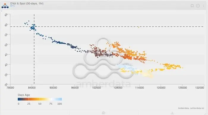 查看上图,并注意颜色渐变(浅蓝色到深蓝色分别代表“几天前”)。追踪近期走势,你会注意到一个短暂的窗口期,现货比特币波动率指数攀升至 125 附近,同时隐含波动率也在上升。当时比特币的波动率指标似乎暗示市场或有潜在突破,毕竟此前波动率与现货价格呈正相关性,然而事与愿违,现在每个人知道,行情随后并未如期上涨,而是逆转下跌。