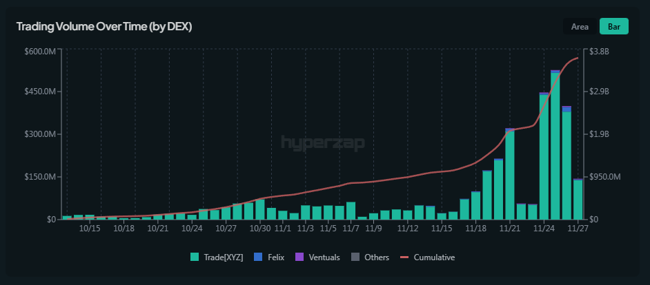 自上线以来,HIP-3的发展速度呈指数级增长,截至11月28日,HIP-3的交易量已经超过36亿美元,相较一个月前增长超十倍。11月25日的单日交易量更是增长至5亿美元。这一数据表现已经相当月Uniswap V3在以太坊的交易量。此外,整个HIP-3市场的交易用户已经达到了1.8万,Hyperliquid截至目前的累计用户则超过80万。