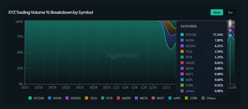 目前,Trade.xyz的王牌产品是XYZ100,这是一个追踪美国前100家非金融科技公司(对标纳斯达克 100 指数)的链上指数合约。截至目前,XYZ100的交易量占到Trade.xyz的60%以上。除此之外,它还上线了 NVDA (英伟达)、TSLA (特斯拉)、MSFT (微软) 等热门美股个股的永续合约。
