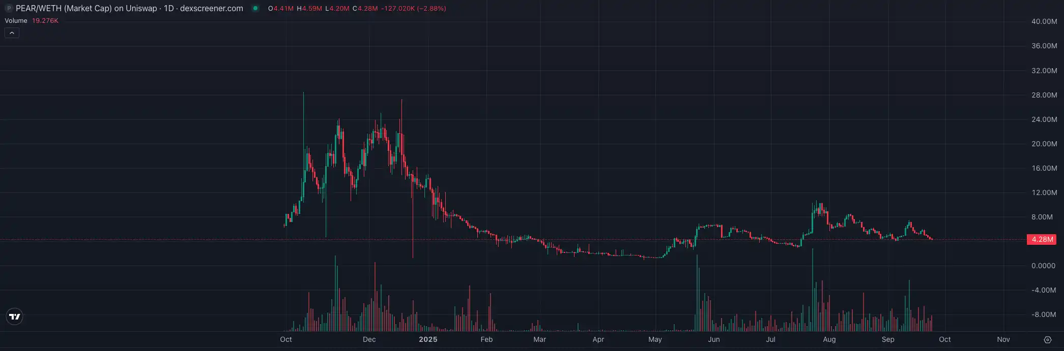 图中所示 Hyperliquid 环境下的 BNB/FTT 能开 3x 的杠杠,而在 SYMM 环境下像 BTC/ETH 这类交易对最高则能拉满 54x 杠杠当前 Pear Protocol 的平台代币 $Pear 在 Arbitrum 上发行,现市值 420 万美元,FDV1500 万美元。