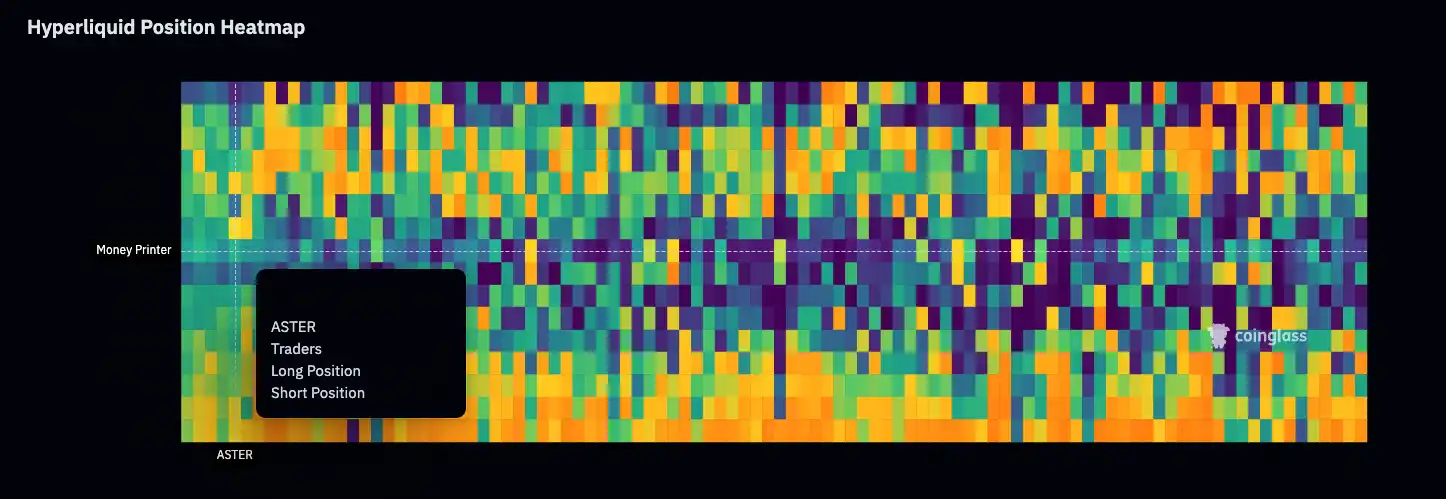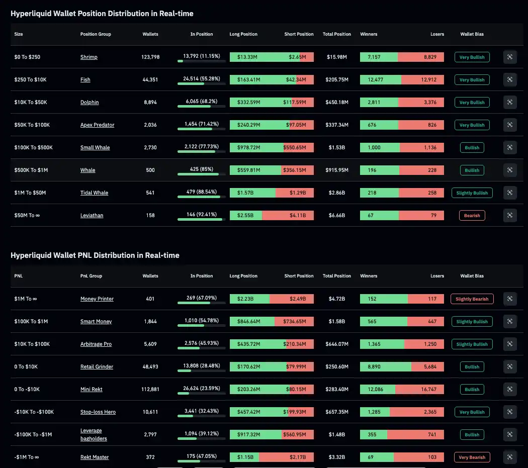 如图所示是赚了 100 万美元以上的「MoneyPrinter」对 Aster 这个币当前的态度第二个则是这 16 种用户类型当前是多空和输赢的整体比例相关信息,大体上一看相当能够反映每位置的玩家现在对待市场的态度,比如像是笔者这样 0 到 250 美元的 Shrimp 或者 250 美元到 1 万美元的 Fish 开仓的比例都不高,反而是超过 1 万美元的类型玩家几乎都在上仓位操作。