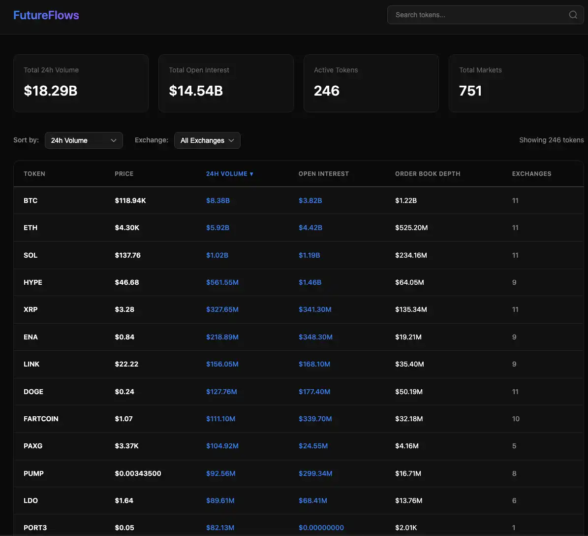 不同于 Coinglass 的代币交易量的热力图,Future Flows 提供的是更加整体性的数据,他收录了市面上大部分的 PerpDex 数据,而从这个看板上可以聊到到大部分代币的整体链上交易情况。