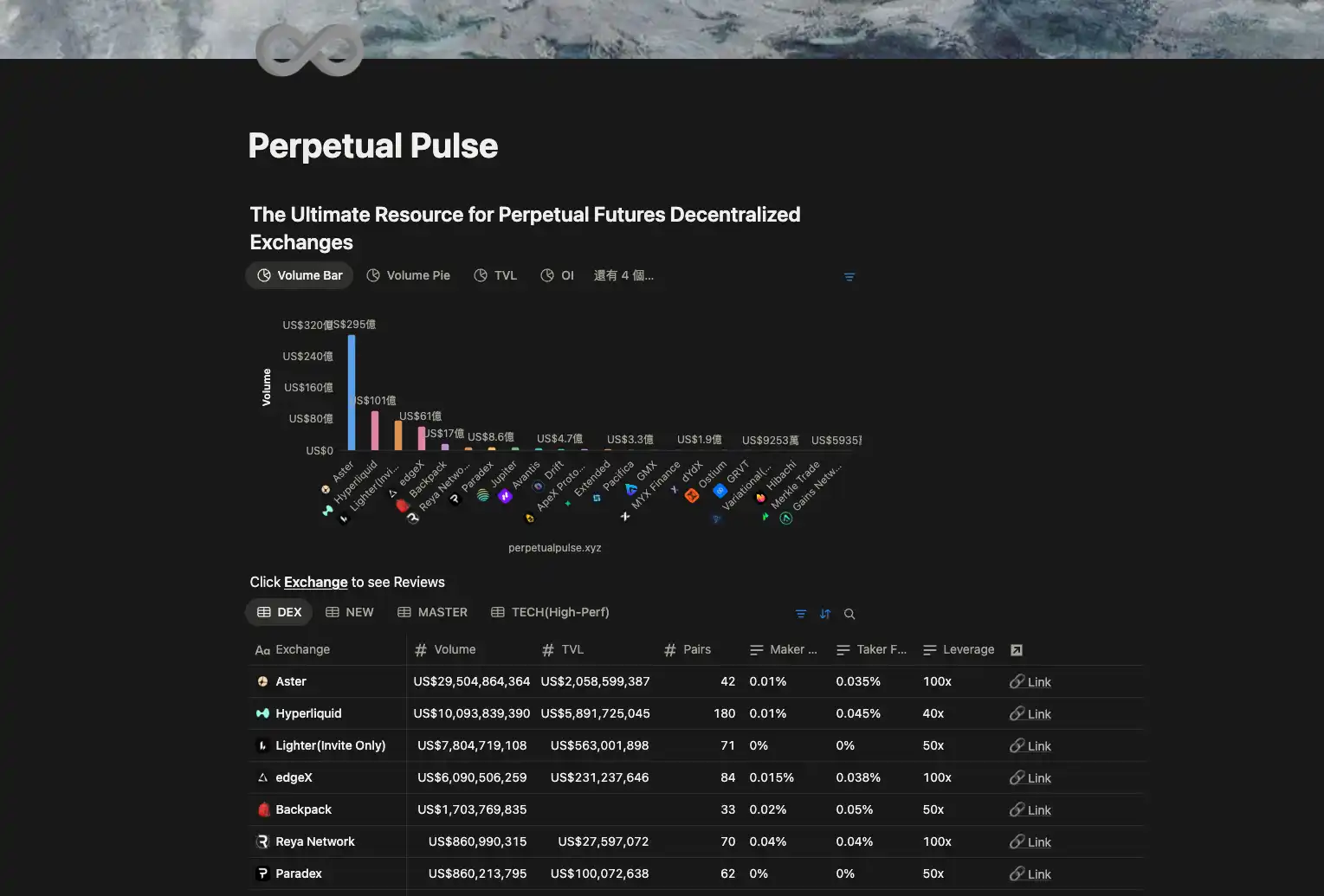 Perpetual Pulse 是 Lighter 的团队成员 hansolar 做的 PerpDex 数据仪表板,提供类似的整体市场数据监控功能。它对多链路的合约交易量和 TVL 还有 OI 进行追踪,并可实时更新行情变化。