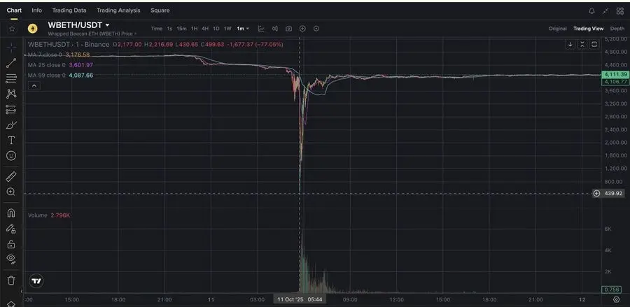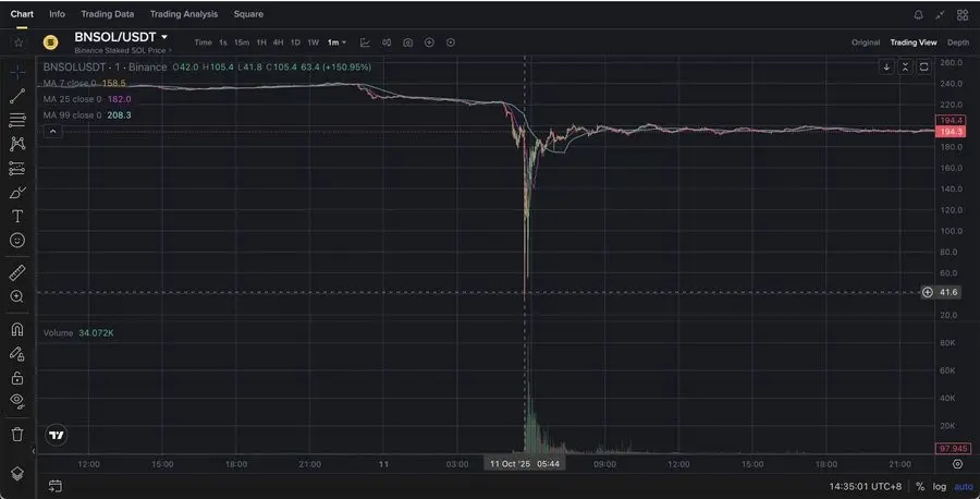 - 上午5:50:最大错位WBETH 达到 430.65 USDT(较平价下跌-88.7%)BNSOL 触底于 34.9 USDT(-82.5%)买方流动性完全缺失