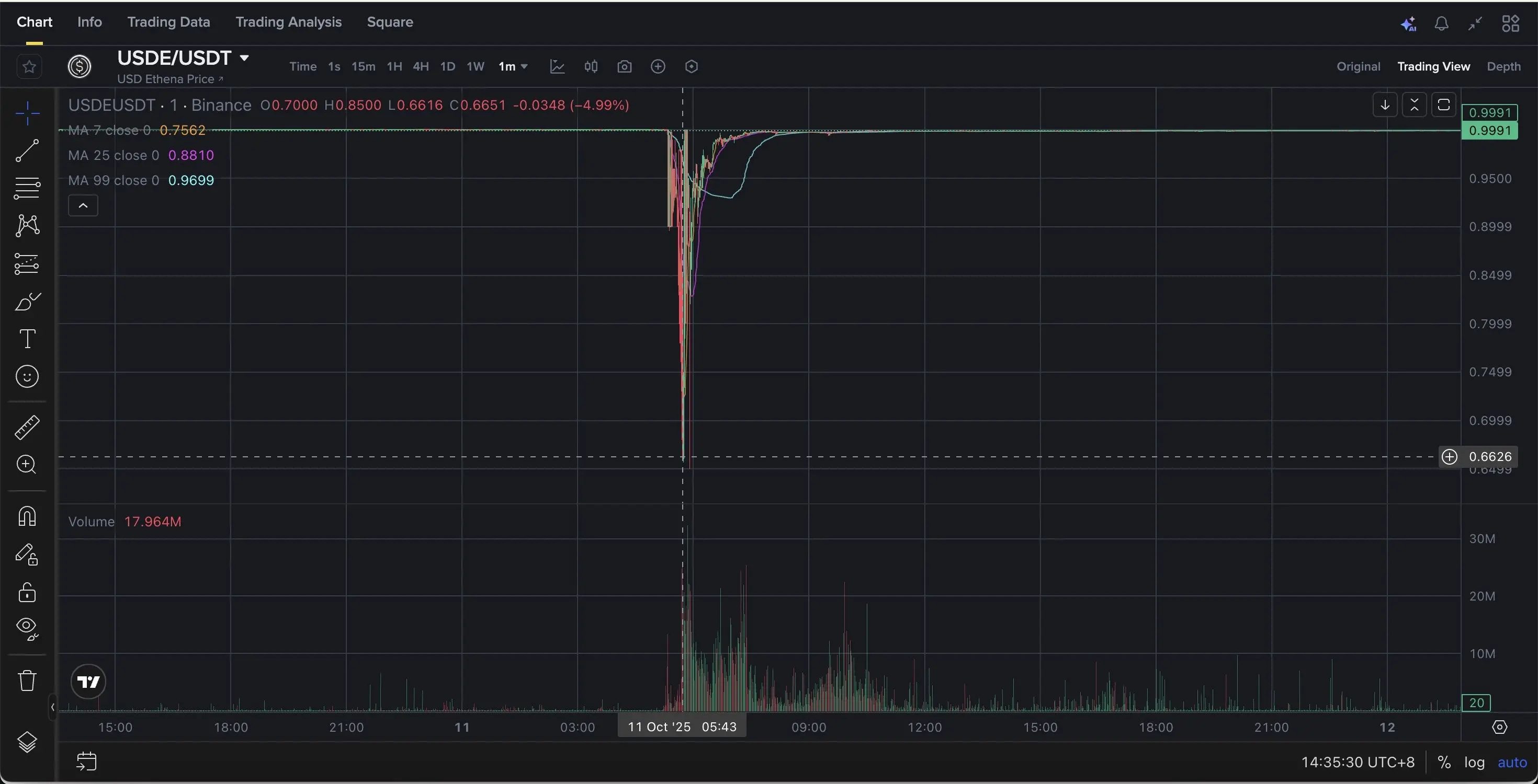 - USDe:在币安上暴跌至 $0.6567,而在其他交易所仍维持在 $0.90 以上。
