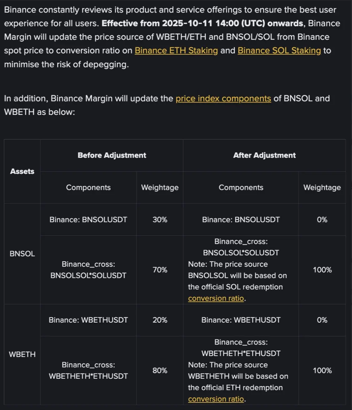 事件变得更加有趣。早在 10 月 6 日,币安就宣布将更新 WBETH 与 BNSOL 的定价机制,并预计在 10 月 14 日生效(现已改成 10 月 11 日)。而这次崩盘正好发生在 10 月 10 日至 11 日——精准地落在这个公告发布后、新机制生效前的“漏洞窗口”期内。