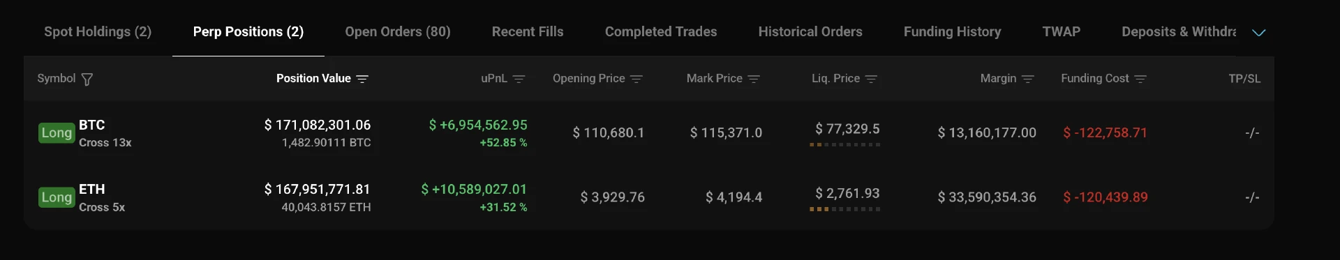 HyperBot数据显示,“10.11 至今胜率 100%巨鲸”目前持有的 13 倍 BTC 多单和 5 倍 ETH 多单已浮盈约 1754 万美元,且暂时仍未止盈,三小时前该巨鲸甚至还追加建仓了 1868 枚 ETH 多单。目前,该巨鲸的持仓总价值约 3.39 亿美元,其中 BTC 多单价值约 1.71 亿美元,开仓价为 110680 美元;ETH 多单价值约 1.68 亿美元,开仓价为 3929 美元。