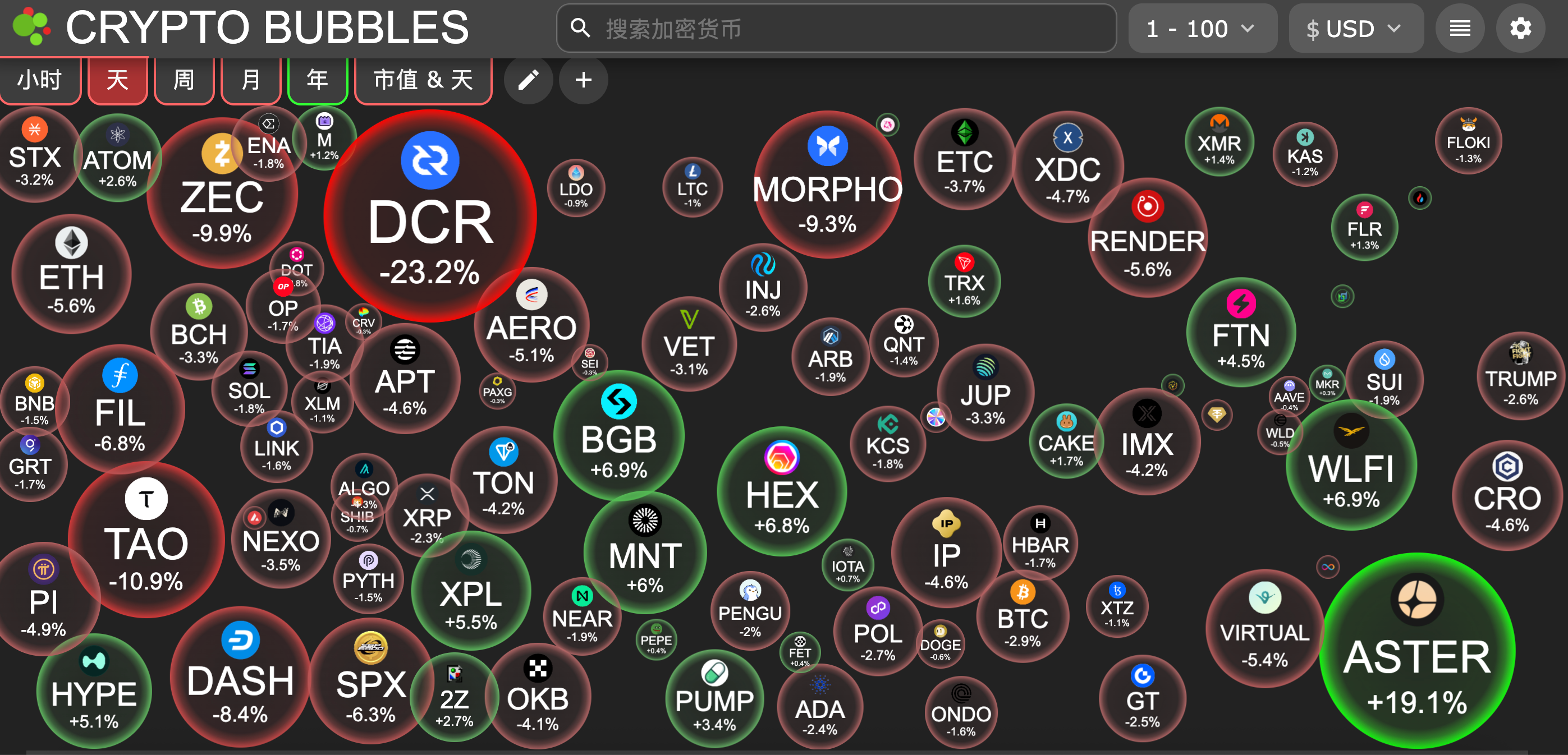 今日市值前100币种最大涨幅:Aster涨19.1%、World Liberty Financial涨6.9%、Bitget Token涨6.9%、HEX涨6.8%、Mantle涨6%。