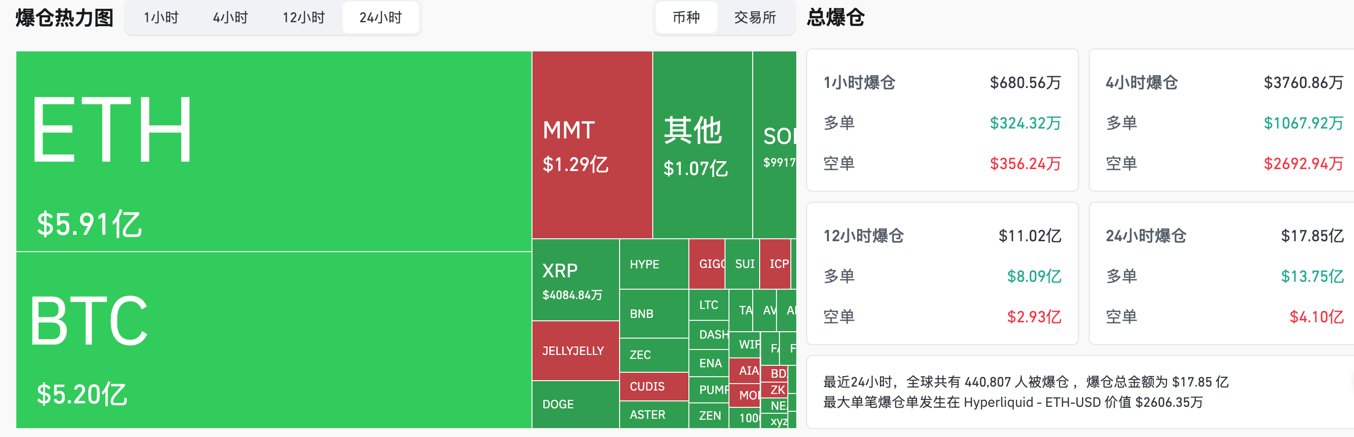 - 24小时爆仓数据:全球共440807人被爆仓 ,爆仓总金额为17.85亿美元,其BTC爆仓5.91亿美元、ETH爆仓5.2亿美元、MMT爆仓1.29亿美元