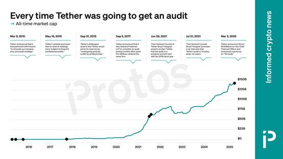 按这个价格计算,Tether 当时估值仅 120 亿美元。作为对比,竞争对手 Circle 的市值约为 300 亿美元,而 Tether 的 USDT 流通量是 Circle 的 USDC 的两倍多。