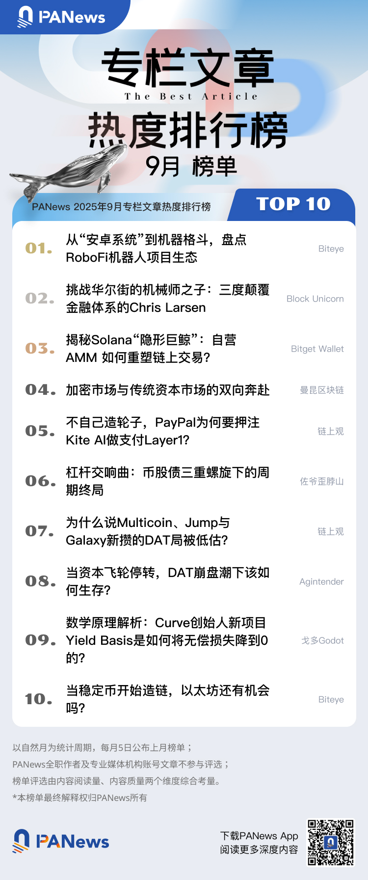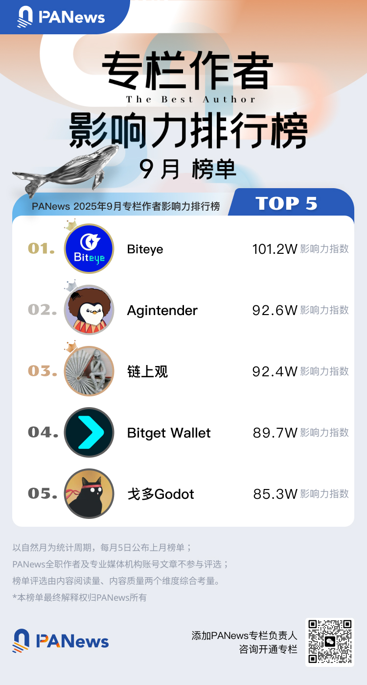 PANews 2025年9月专栏作者影响力排行榜TOP5及专栏文章热度排行榜TOP10(以下简称“双榜”)于今日出炉,我们对9月份PANews平台上的所有专栏作者发文情况及所有专栏文章热度进行了综合性评定,制作出双榜。
