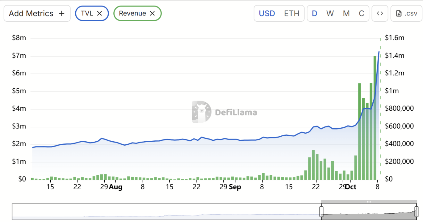 BNB Chain 生态的 meme 币也虹吸了 Solala 生态的不少资金。DefiLlama 数据显示,其 meme 平台 Four.meme 其 TVL 从 2 万美元跃升至 7 万美元上方,日收入从 60 万美元跃升至 140 万美元,累计收入达到 2131 万美元。