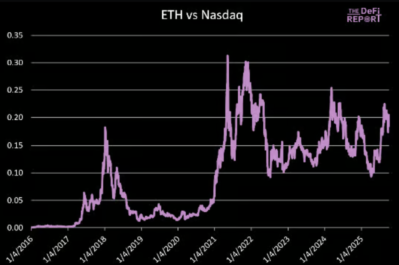 数据来源:The DeFi Report2021 年 5 月和 11 月,以太坊与纳斯达克指数的比值峰值分别为 0.31 和 0.30。