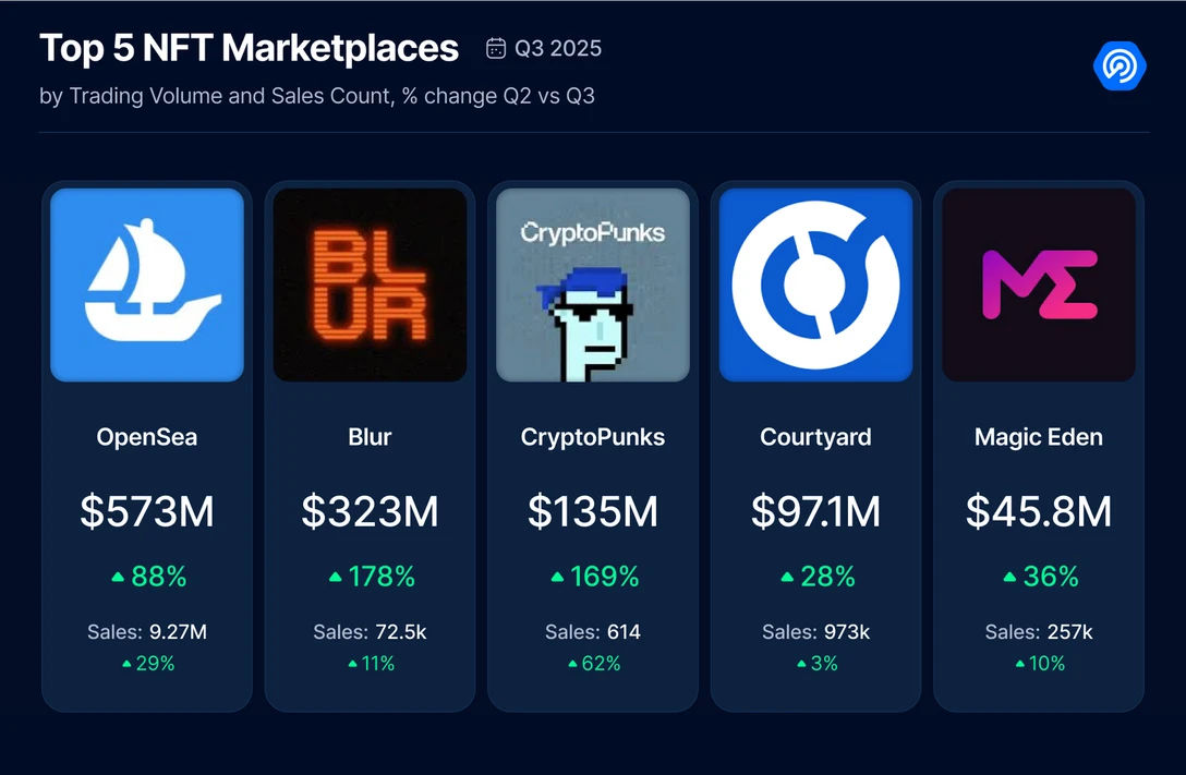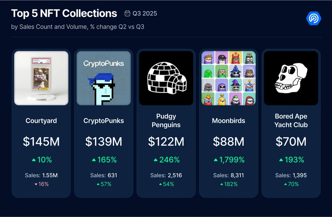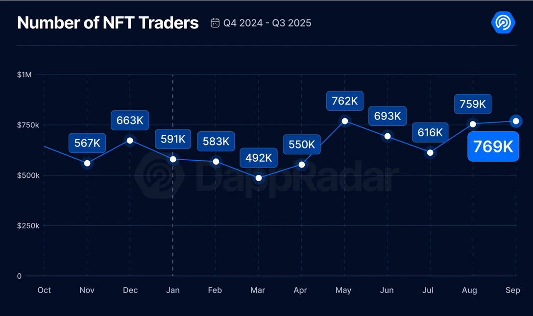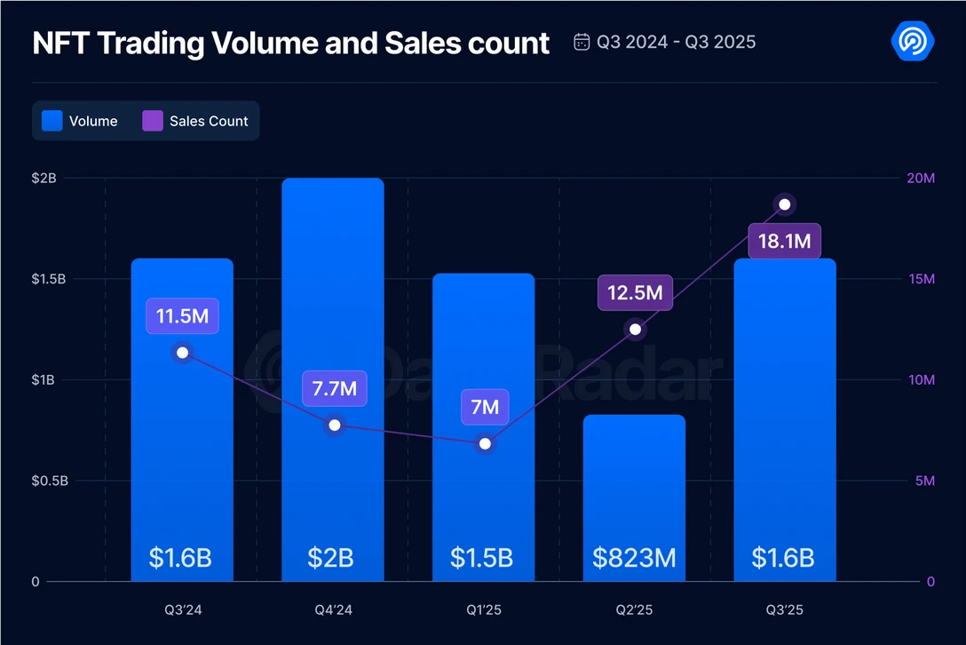 由于如今许多 NFT 的交易价格较低,交易额略有下降。然而,2025 年的交易数量有所增加。第一季度记录了 700 万个 NFT 的销售量,第二季度达到 1250 万个。这一上升趋势仍在持续。第三季度,市场记录了超过 1810 万个 NFT 的销售量,创造了 16 亿美元的交易额。
