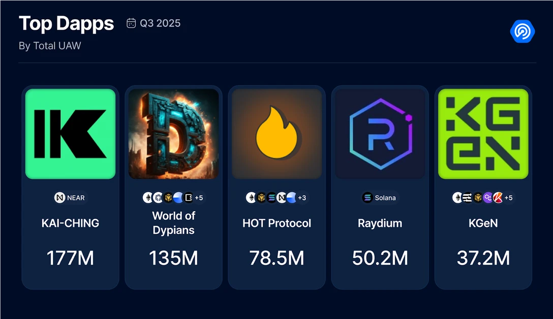 今年早些时候,游戏、DeFi 和 AI 占据主导地位,社交和 NFT 紧随其后。Q3 形势发生了逆转。游戏仍然占据主导地位,但 NFT 的排名有所上升,目前位居第二。DeFi 和 AI 紧随其后,而社交现在是市场中最弱的领域,被“其他”类别中种类繁多的 Dapp 所超越。
