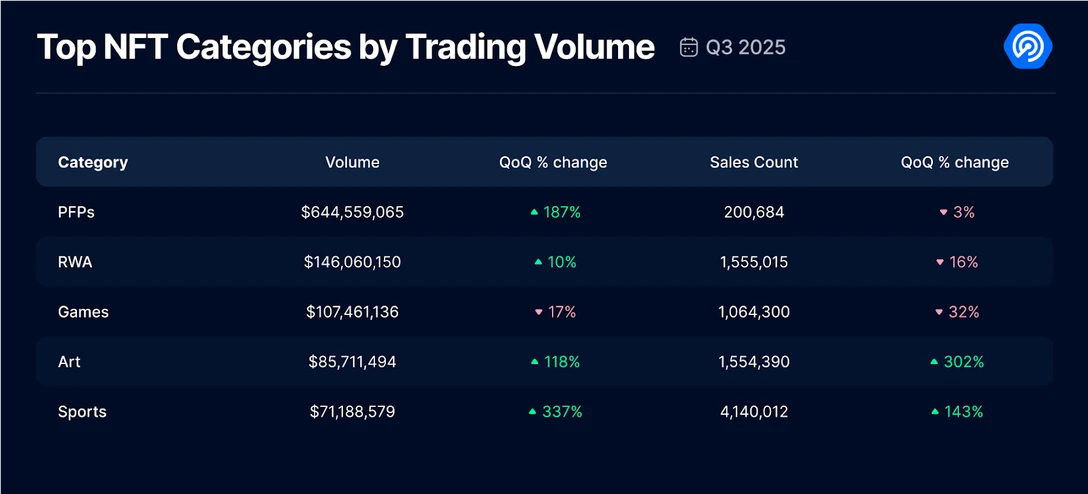 NFT 市场的销量飙升至 1810 万个,凸显了其不断演变的角色,已超越收藏品范畴,与 DeFi 和现实世界资产相融合。游戏领域仍占据主导地位。