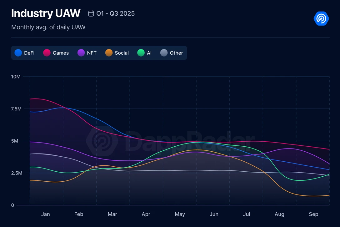 Dapp整体使用率下降:2025年第三季度,Dapp日均活跃钱包数量为1870万个,较上一季度下降22.4%。社交和AI类Dapp下降最为显著,而游戏类别以25%的市场份额保持主导地位,NFT(18.5%)和DeFi(