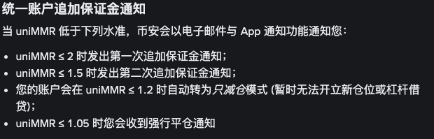统一账户维持保证金率 低于/等于1.2 时账户将进入“僵直模式”(没法开仓),在低于/等于1.05的时候就会强行平仓。 (这个信息非常关键!!后面会考)