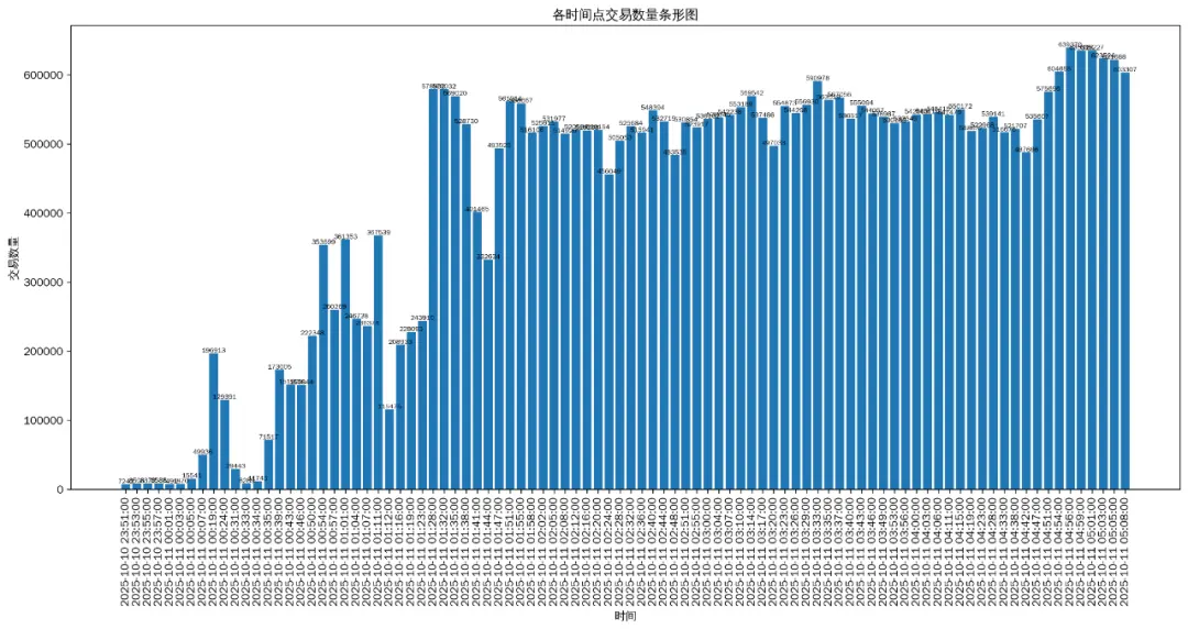 由Beosin统计制作在10月11日04:56,Batch#55743处理交易数达到最大值,2分钟内完成了639370笔交易,是平常时段每分钟处理交易数的79.8倍。通过统计Lighter本次事件的数据我们发现,Lighter的Batch最多可容纳1600个区块,其区块最多可容纳500笔交易,其理论可处理交易笔数为800000/Batch,而实测最高为639370。