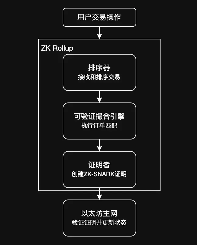 撮合引擎:接收来自排序器的Batch,并严格遵循 "价格优先、时间优先" 的撮合逻辑。每次成功的撮合都会为生成零知识证明准备好数据,确保任何人都能事后验证撮合过程的公平性,避免了操纵的可能。