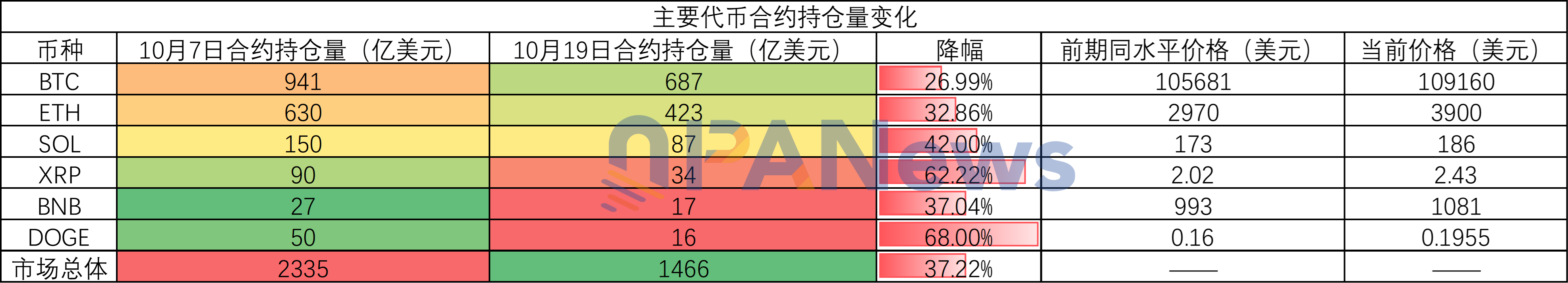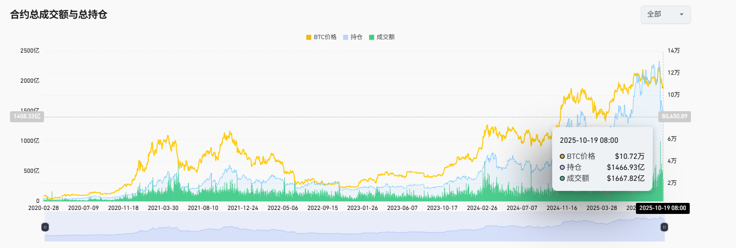 首先从合约的持仓量来看,市场总体的合约持仓量随着这场暴跌出现了大幅下降,根据Coinglass的数据显示,10月8日,市场的未平仓合约总量达到了历史高点2335亿美元,而到了10月19日,这一数据下降至1466亿美元,降幅达到了37%。