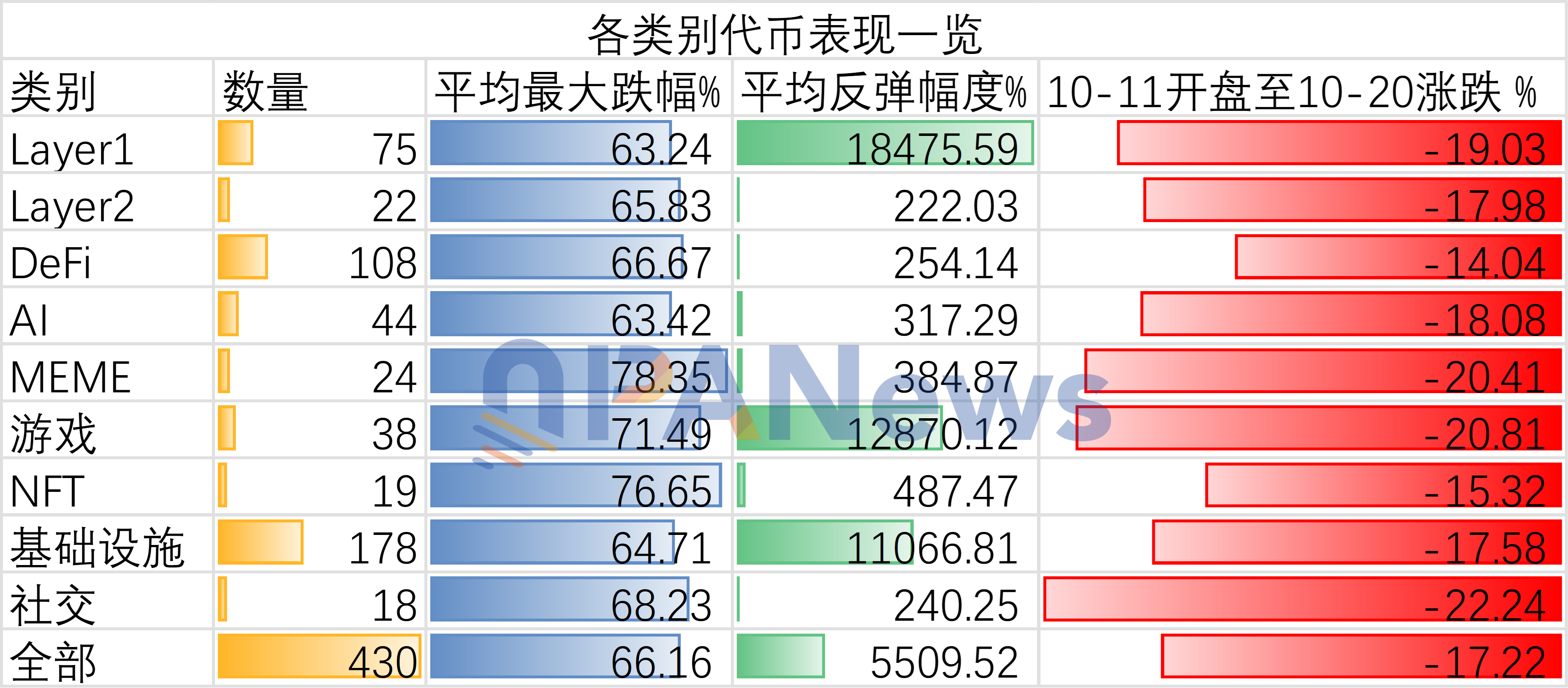 整体来看,DeFi和AI类别的代币整体要好于平均水平,首先在平均最大跌幅方面,这两个类别基本和整体水平打平,AI类别的平均最大跌幅约为63%,要好于整体的水平。而在10月11日开盘至10月20日跌幅方面,DeFi代币的数据为14%,说明DeFi类代币的反弹效果要强于整体水平。
