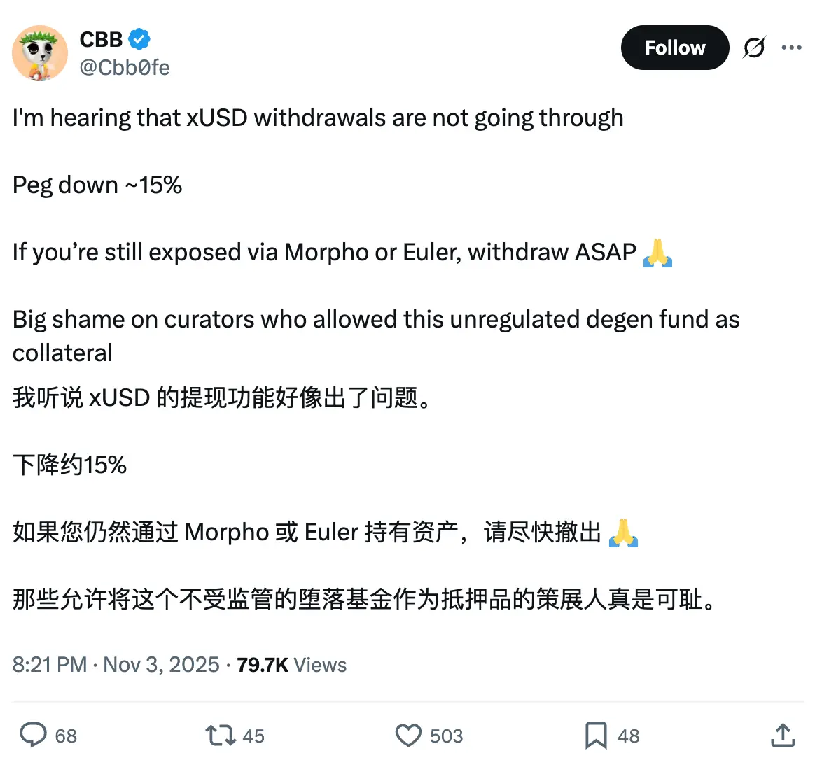 随后,Stream Finance 的 xUSD 稳定币价格大幅脱离其目标区间,表现出明显的脱锚现象。